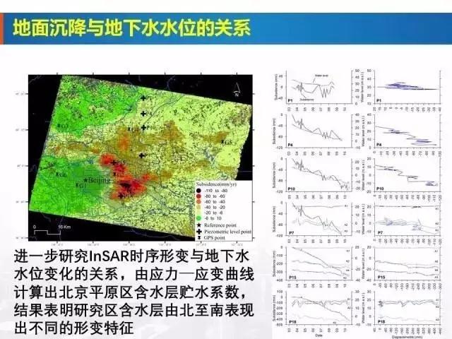 上图是我们运用雷达遥感技术研究的北京地区地面下沉的情况。红的地区,是一个漏斗状的,它的年下沉速度达到了100mm/年,是在北京市东部、东北部交叉。朝阳东部咸宁侯到双桥一带,沉降严重,靠近通州,因为通州现在是一个副城市中心。我们用GPS、北斗验证了刚才这个结论是正确的。