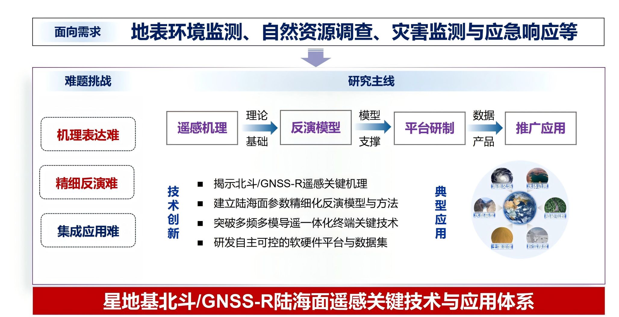项目聚焦北斗/GNSS反射遥感(GNSS-R)这一新型对地观测技术,面向全球变化、自然资源调查与监测、灾害监测与应急响应等重大需求,揭示了GNSS-R遥感关键机理,建立了陆海面参数精细化反演模型与方法,突破了多频多模导遥一体化终端关键技术,形成了星地基北斗/GNSS-R陆海面遥感技术与应用体系,促进了卫星大地测量与水文、气象、海洋等领域的交叉融合。项目关键技术及解决方案在测绘遥感、气象与灾害监测、智慧水利、生态保护等领域推广应用,产生了显著的经济效益与社会效益。