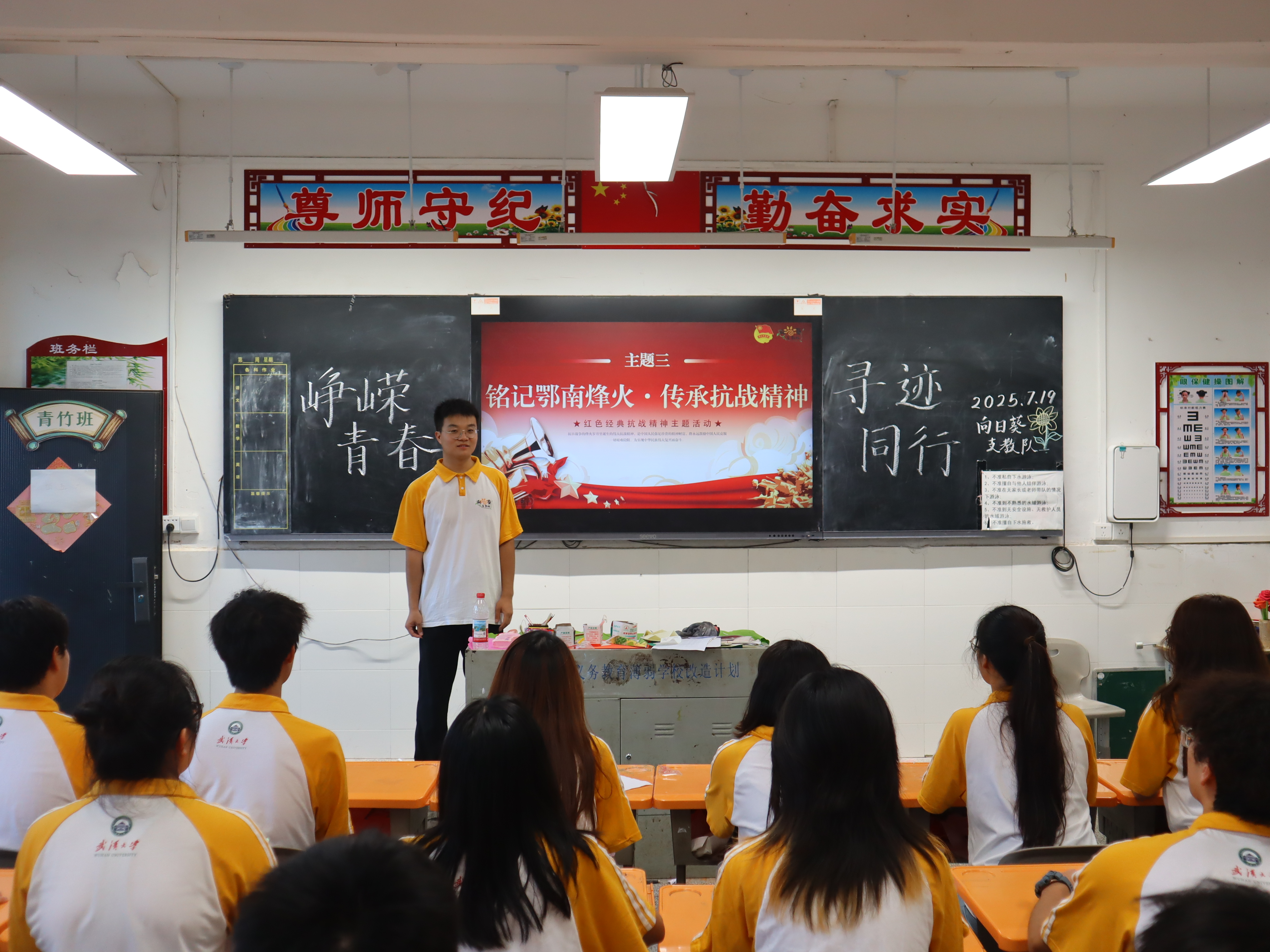 在抗战精神学习会上,队员王书凯动情讲述赤壁军民“一寸山河一寸血”的壮烈史诗,孩子们与队员共同宣誓“传承红色血脉,强国有我”。