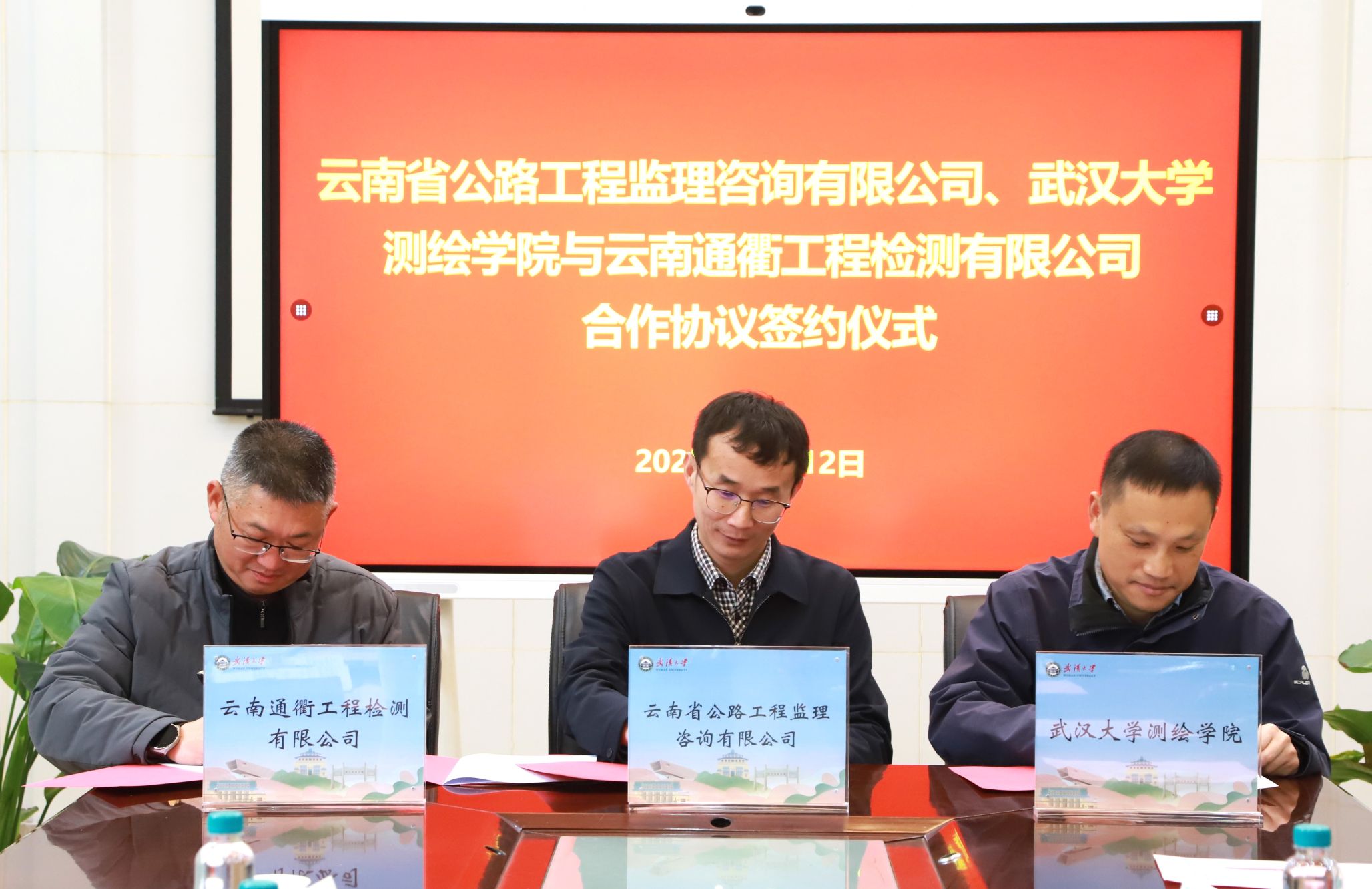 2025年12月12日,我院与云南省公路工程监理咨询有限公司、云南通衢工程检测有限公司签订三方合作协议。云南省公路工程监理咨询有限公司副总经理李昌洲、云南通衢工程检测有限公司执行董事耿国锋、院长邹贤才出席活动。签约仪式由金涛勇副院长主持。