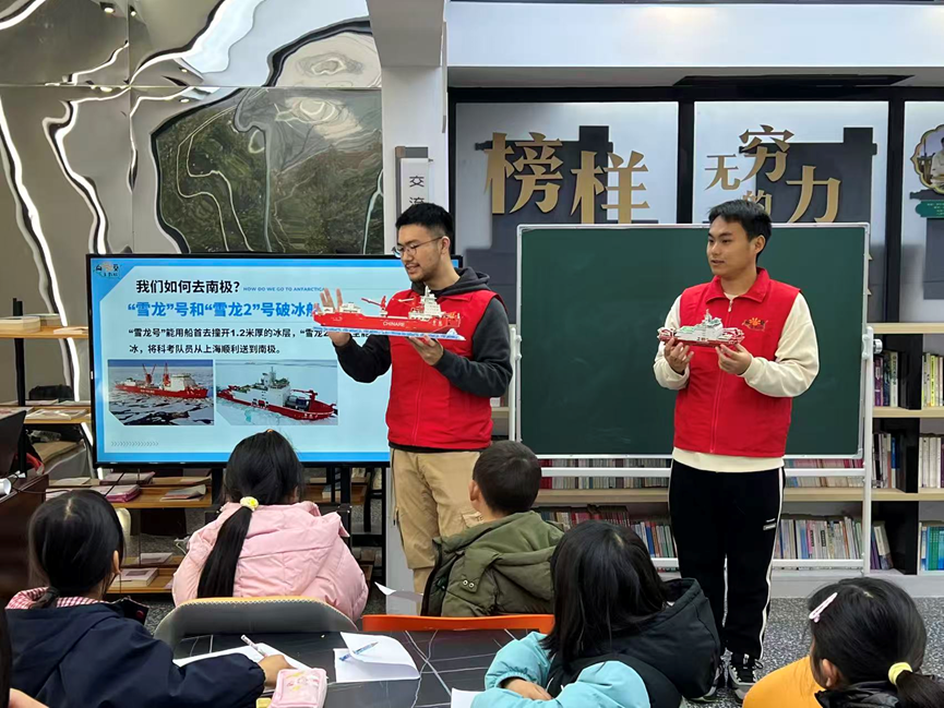除了自然奇观,朱圣鸿还分享了中国南极科考的硬核实力:“雪龙号”能以船首撞开1.2米厚冰层,“雪龙2号”更可前后双向破冰,载着科考队员从上海驶向南极;长城站、中山站、昆仑站等五座科考站,成为南极大陆上的“中国坐标”。更动人的是他与极地的不解之缘:2019年暑假,《在南极的500天》一书在他心中种下探索的种子;2022年高考后,他毅然选择足球欧洲杯 ,并深耕专业,如今已获得直博生资格,朝着梦想稳步前行。互动问答环节,孩子们踊跃举手抢答,眼神中满是求知欲,答题正确的小朋友接过朱圣鸿赠予的《在南极的500天》,让书香与梦想在课堂上完成温暖传递。