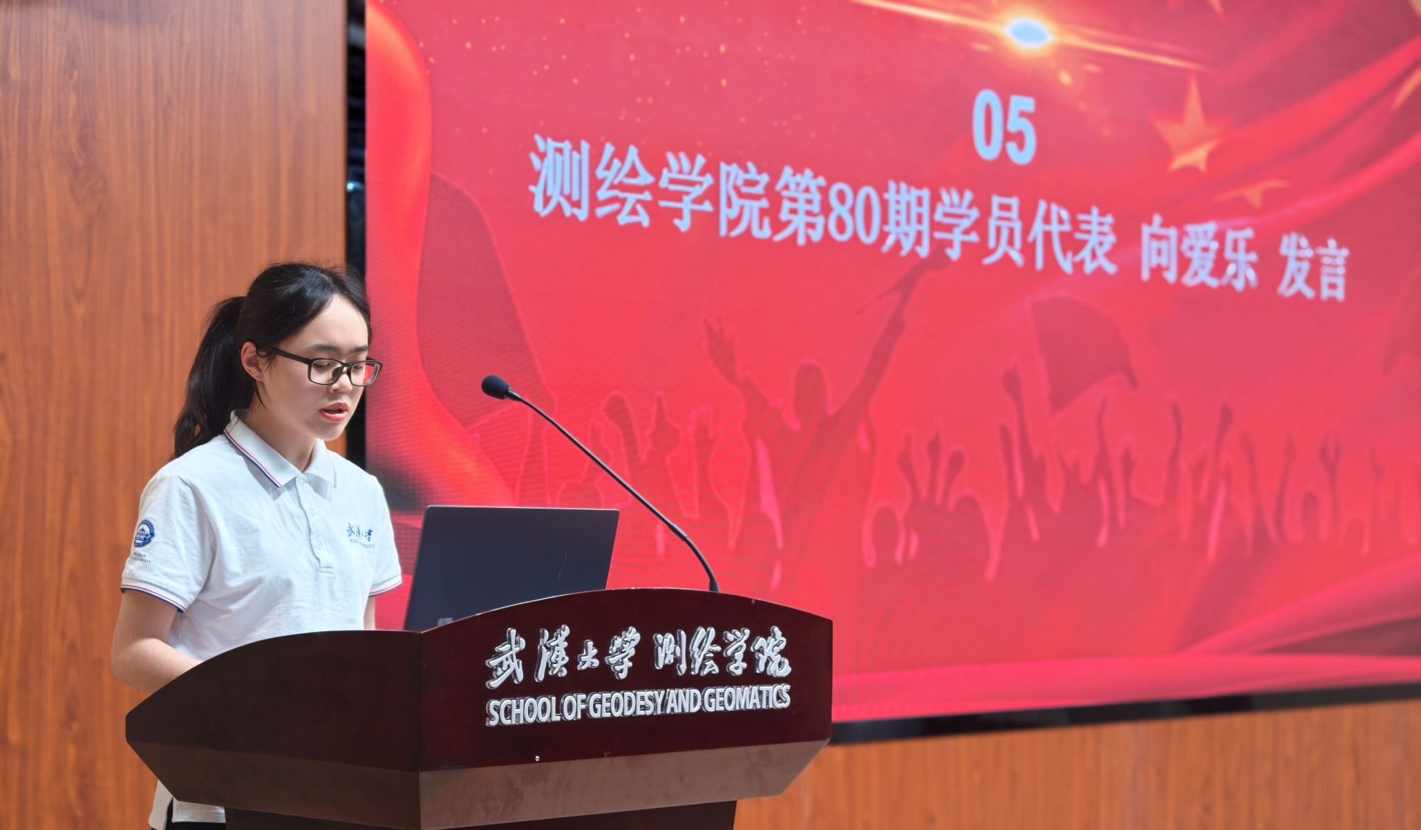 第80期入党积极分子培训班学员代表向爱乐发言。她从优秀党员事迹与家乡党员教师扎根基层、投身脱贫攻坚和乡村振兴的亲身经历出发,深刻体会到党的初心与使命。作为共青团员,她一直主动学习党的理论知识,进入大学后第一时间递交入党申请书,并将此次培训作为思想淬炼与理论提升的重要契机。她表示,将结合时空信息工程专业,胸怀“国之大者”,在思想上加强理论学习、在学习上钻研专业本领、在生活中严于律己、积极奉献,以实际行动向党组织靠拢,努力成长为一名合格共产党员。