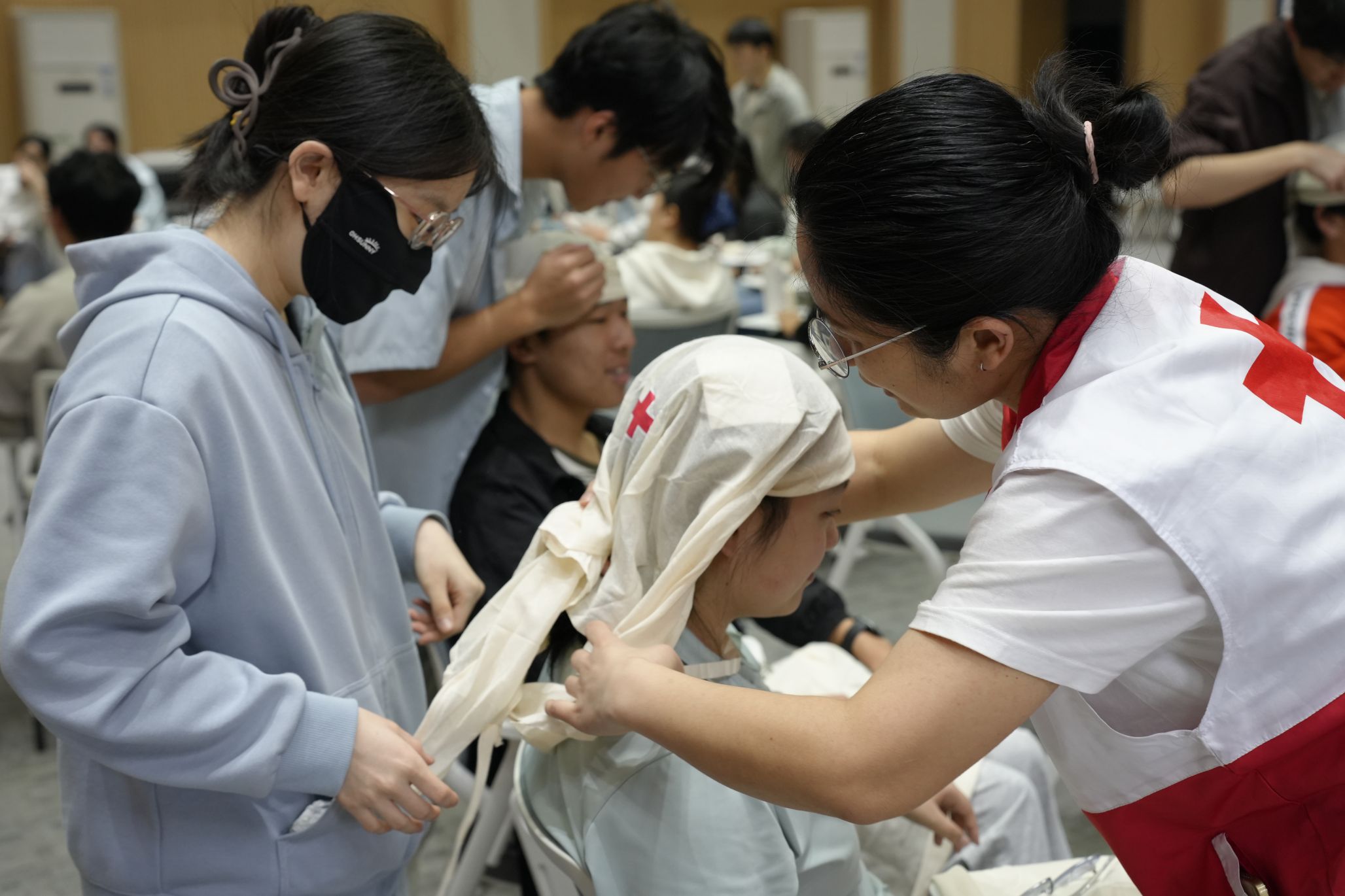 当日下午,实操训练课程在信息学部徕卡厅有序开展。在红十字会讲师的专业指导下,学员们分组开展心肺复苏模拟、AED操作、创伤包扎与固定等实操练习,讲师团队坚持“手把手”教学、情景化演练,逐一对学员的操作流程进行规范指导,确保每位学员都能熟练掌握标准操作方法,真正做到学以致用。