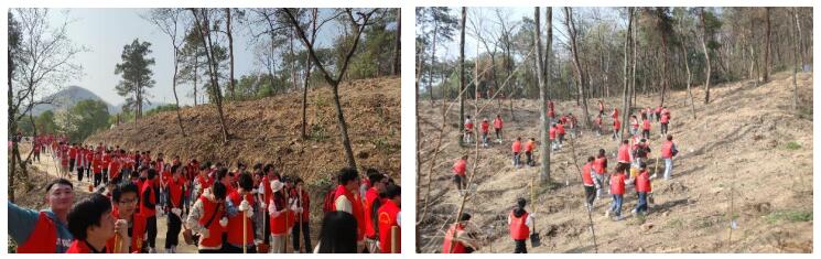 9日下午两点,本科生党总支一行近150人顺利抵达武汉市蔡甸区嵩阳林场。正式植树前,林场工作人员悉心指导大家如何正确植树,他们耐心地向大家讲授诸多细节:在栽种树苗之前,坑中需要先垫一些肥土;放树苗时,树干要扶直;不要过分追求数量,要注意质量,要种一棵树活一棵树。在工作人员的指导和同学们的互相帮助中,大家迅速掌握了植树的步骤和要领,一株株树苗逐渐屹立于山林。